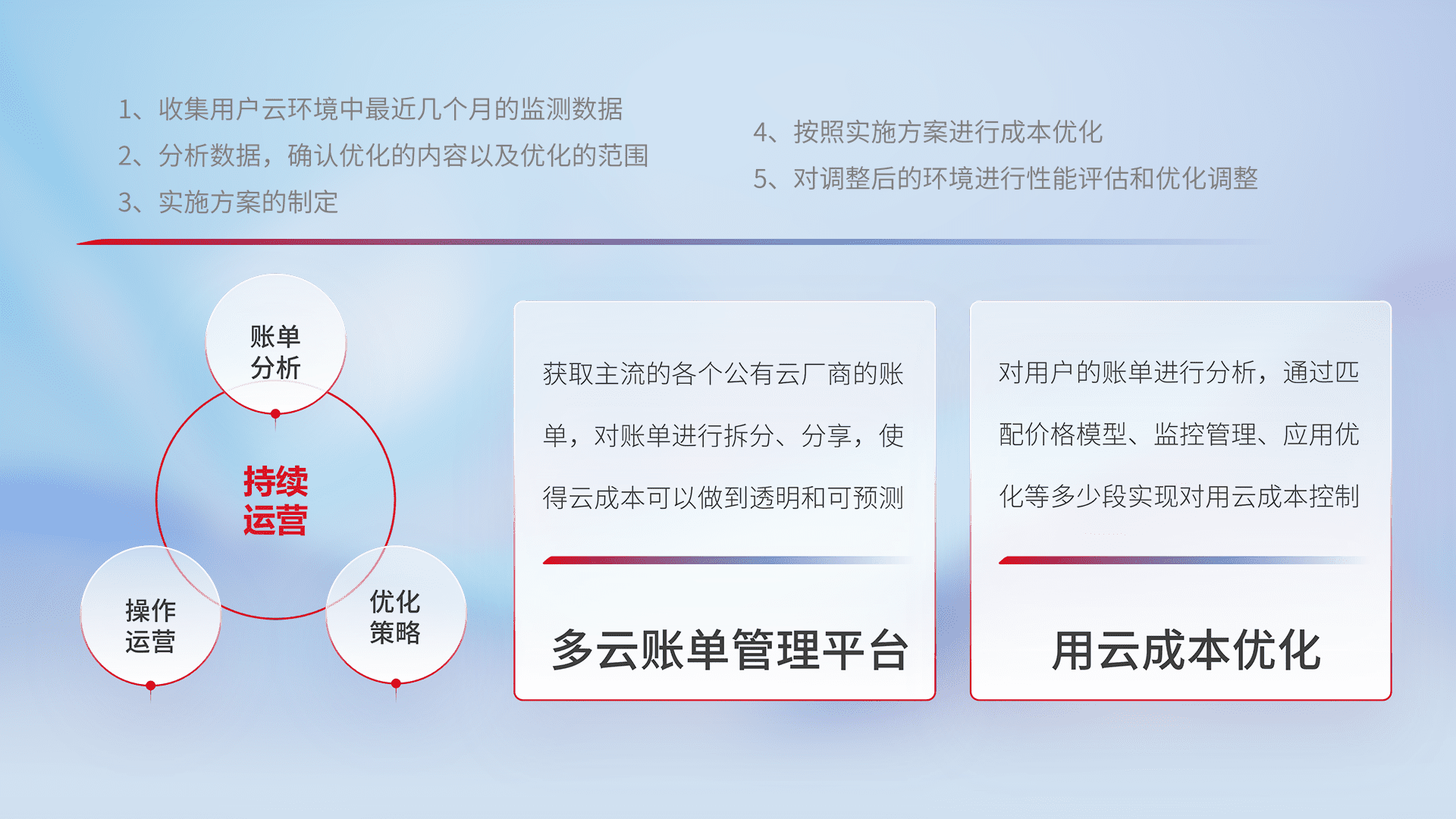 通过多云纳管,,,以统一的资源数据模型把客户的云资源进行抽象和封装,,,进而实现对多云资源的统一操作,,,保障云资源管理的可靠性、、、稳定性与可用性。。。量身定制化运维内容,,配置、、、开发运维、、、、补丁管理、、备份、、、监控、、认证和访问管理、、、、审计和日常巡检等,,,保障在用云过程中的可靠度,,,,稳定度以及高可用率。。。